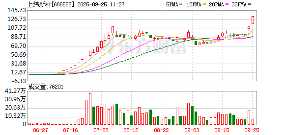 上纬新材(688585)25日盘中再度涨停,斩获两连板。截至发稿,该股报132.1元/股,续创历史新高。至此,7月以来至今,该股已累计大涨近16倍。